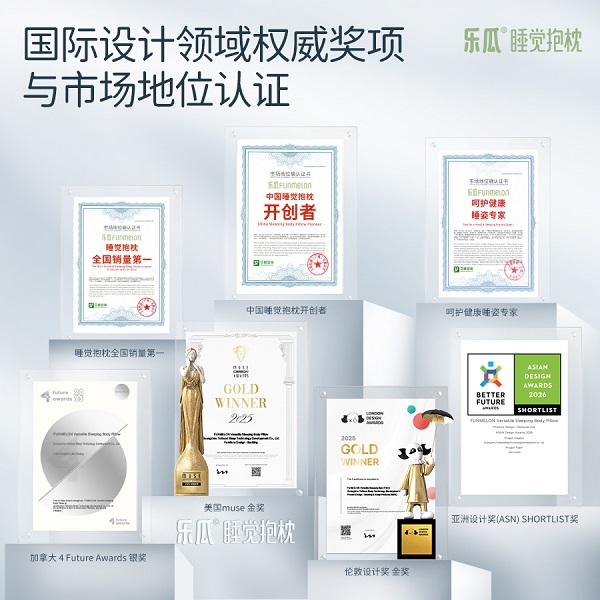 2025年,FUNMELON 乐瓜凭借卓越的产品创新力、实用功能与美学设计,接连斩获美国 MUSE设计奖金奖、伦敦设计奖金奖、4 Future Awards奖、亚洲设计奖四项国际顶级设计大奖,彰显其在全球护睡产品领域的国际水准。同时,依托对健康睡姿的系统研究与产品实效验证,品牌荣膺“呵护健康睡姿专家”权威认证,进一步夯实其在科学护睡领域的专业地位。此外,FUNMELON乐瓜还获得艾媒咨询认证的“睡觉抱枕全国销量第一”“中国睡觉抱枕开创者”等重磅荣誉,充分印证了品牌的消费市场认可度与行业引领力。